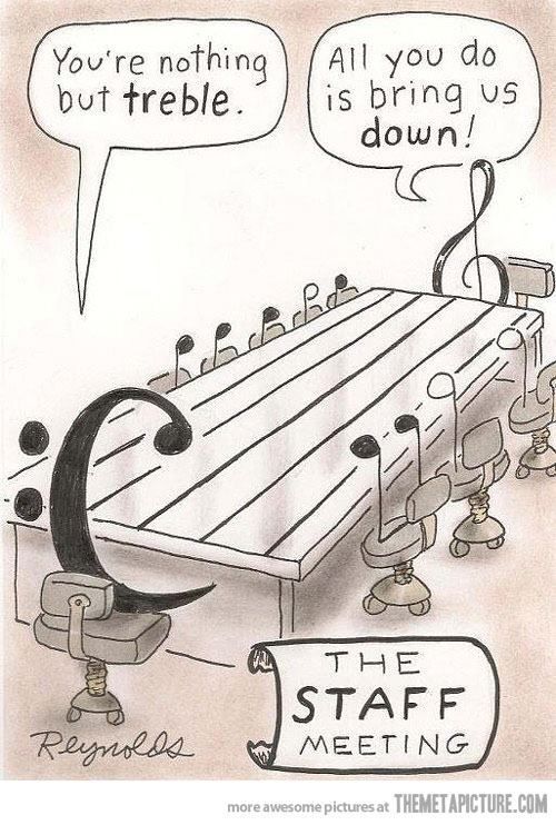 Bass clef: You're nothing but treble/trouble! Treble clef: All you do is bring us down (an octave)!